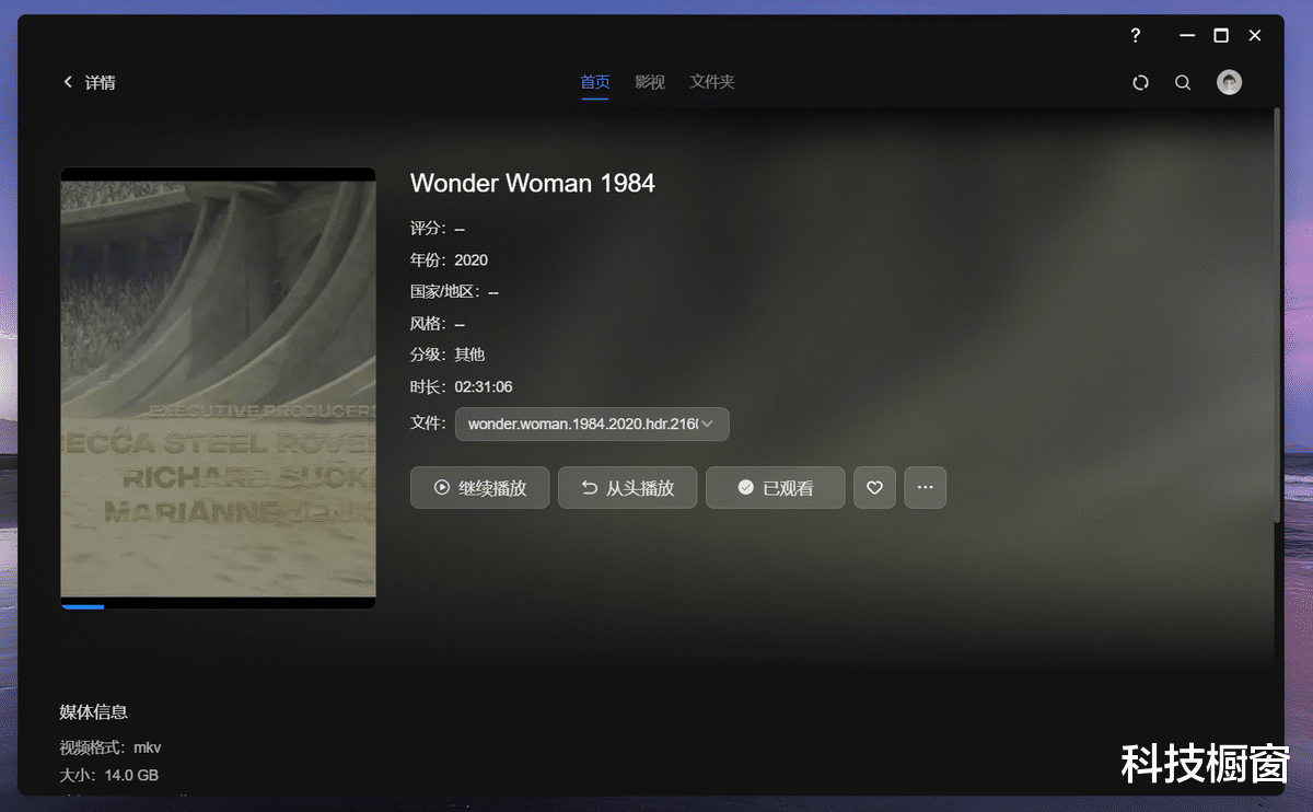 不过需要说明的是,它默认的刮削源是绿联自己影视库,所以会存在资源不全的问题。就比如说,我这里的《神奇女侠1984》它就没有刮削出来。