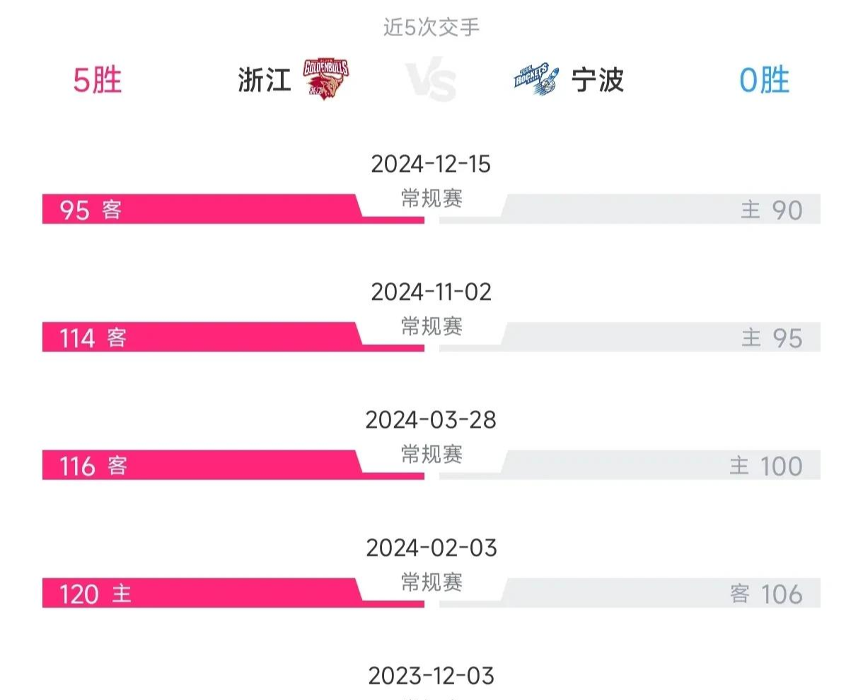 在两支球队过去的5场交手中,浙江取得了全部5场比赛的胜利。看看两支球队,在各自最近5场比赛中的表现,浙江2胜3负,宁波1胜4负。两支球队在最近都遭遇了三连败。