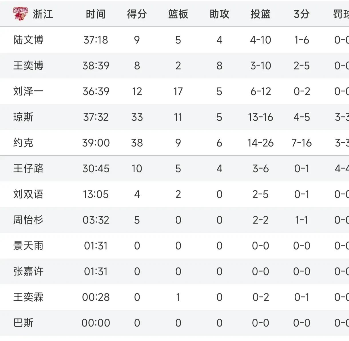 浙江方面,琼斯拿到33分,约克拿到38分,球队一共有4人得分上双,具体数据如下。