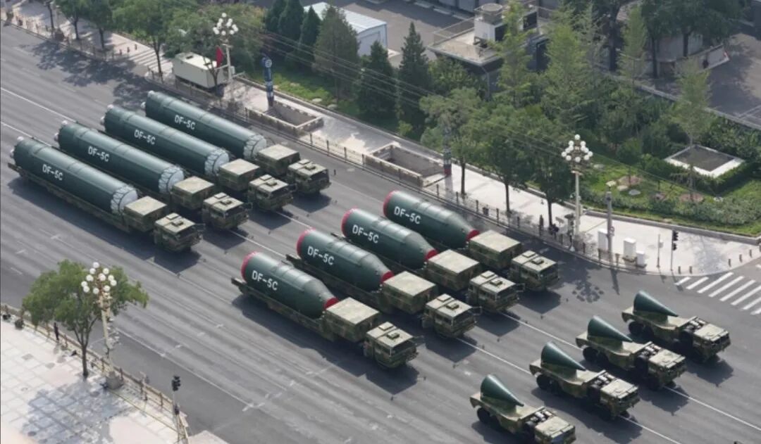 东风-5C,2025年九三阅兵中压轴出场,解说词:该型导弹是我国战略反击体系中的重要组成,打击范围覆盖全球,全时戒备、有效威慑,以武止戈、砥定乾坤。