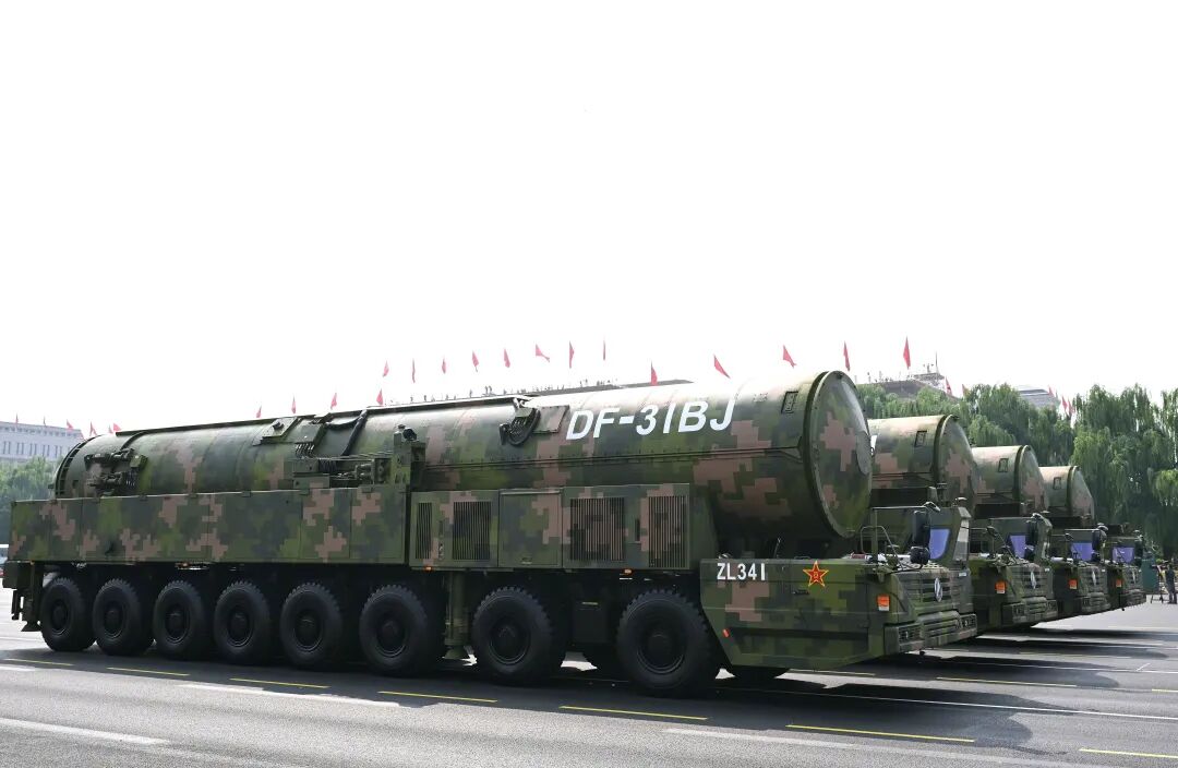 DF‑31BJ,2025年亮相,重大改进型,可能是发射井固体洲际导弹。“B”代表东风-31系列的第二次重大改进型号,“J”可能是指代“井基”。估计射程提高13000公里以上,携带6-7枚分导式核弹头,强化突防能力。
