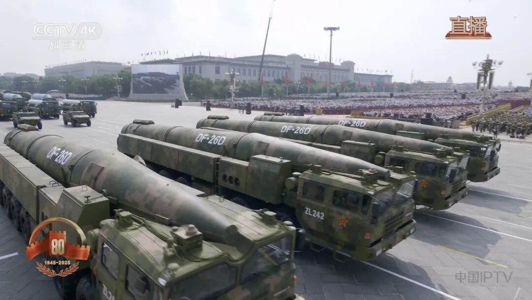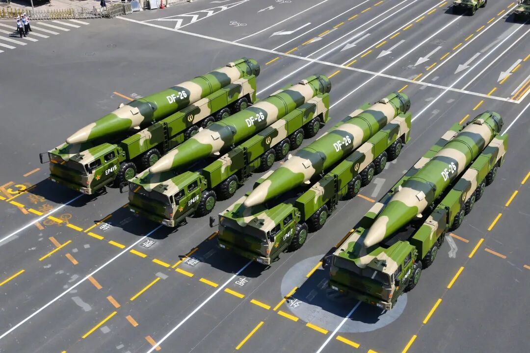 东风-26 中远程弹道导弹核常兼备的新型战略利器,2018年前后入列。具备跨区无依托快速机动发射能力,能够对多种目标进行精确打击,主要负责打击第二岛链的潜在目标,又俗称“关岛快递”。射程约5000公里,战斗部核常兼备,既可遂行快速核反击任务,也可遂行常规中远程精确打击任务。具备对陆上重要目标和海上大中型舰船精确打击能力。