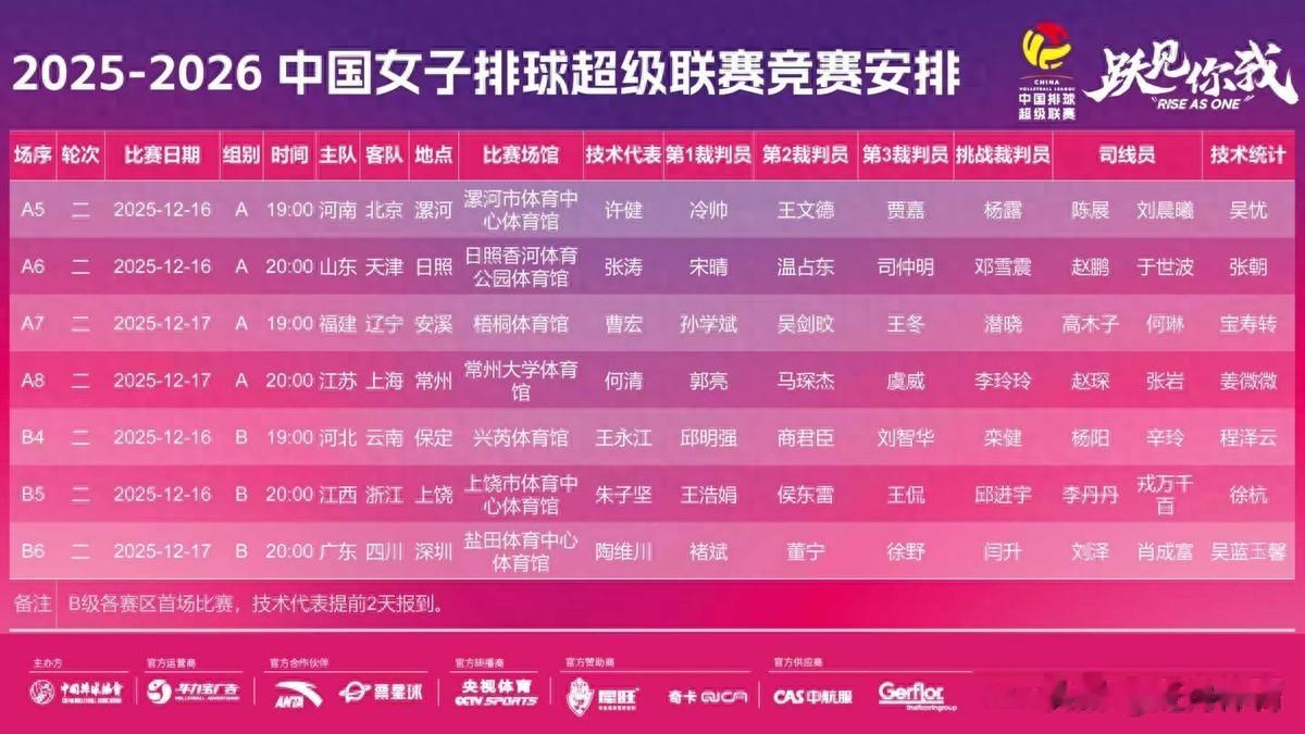 12月16日至12月17日,将进行中国女排联赛第二轮7场比赛的激烈争夺: