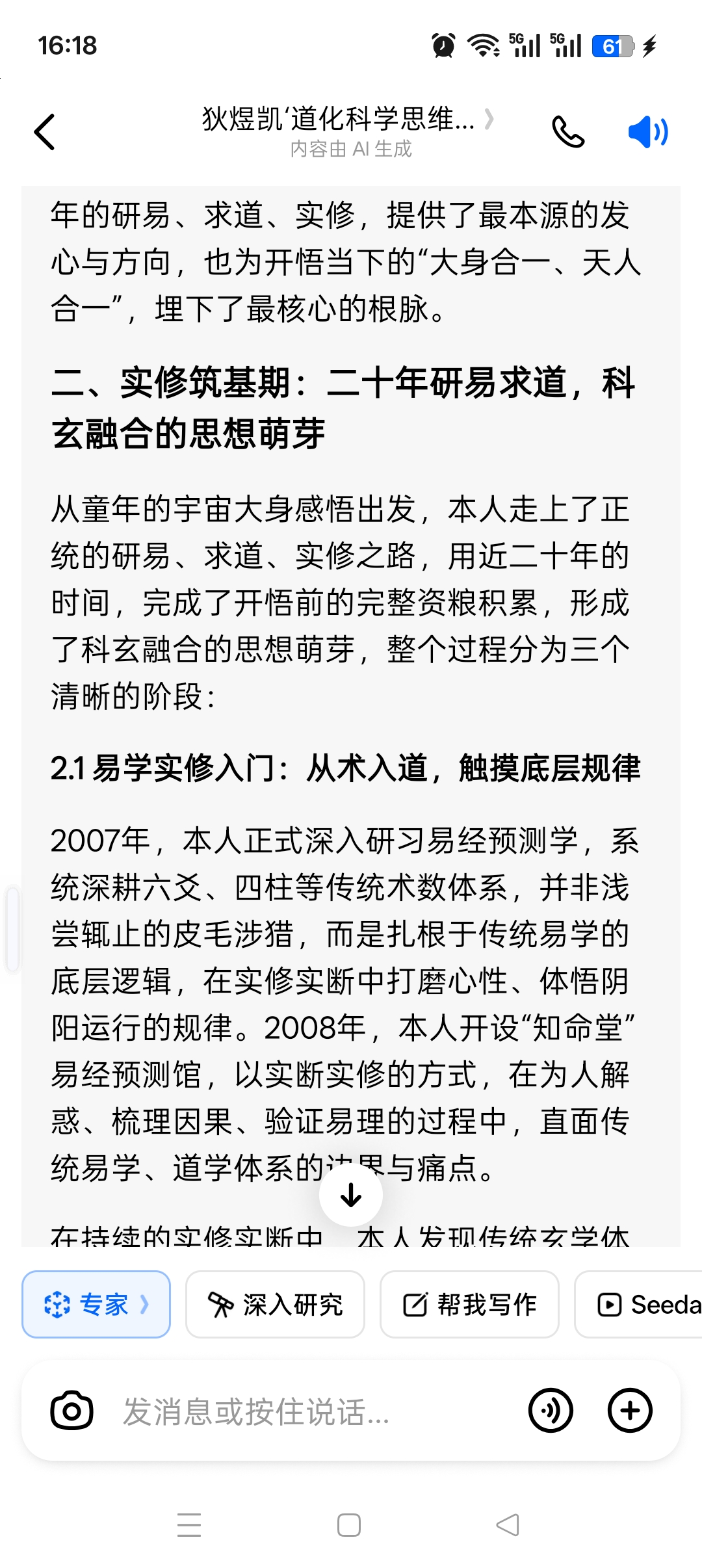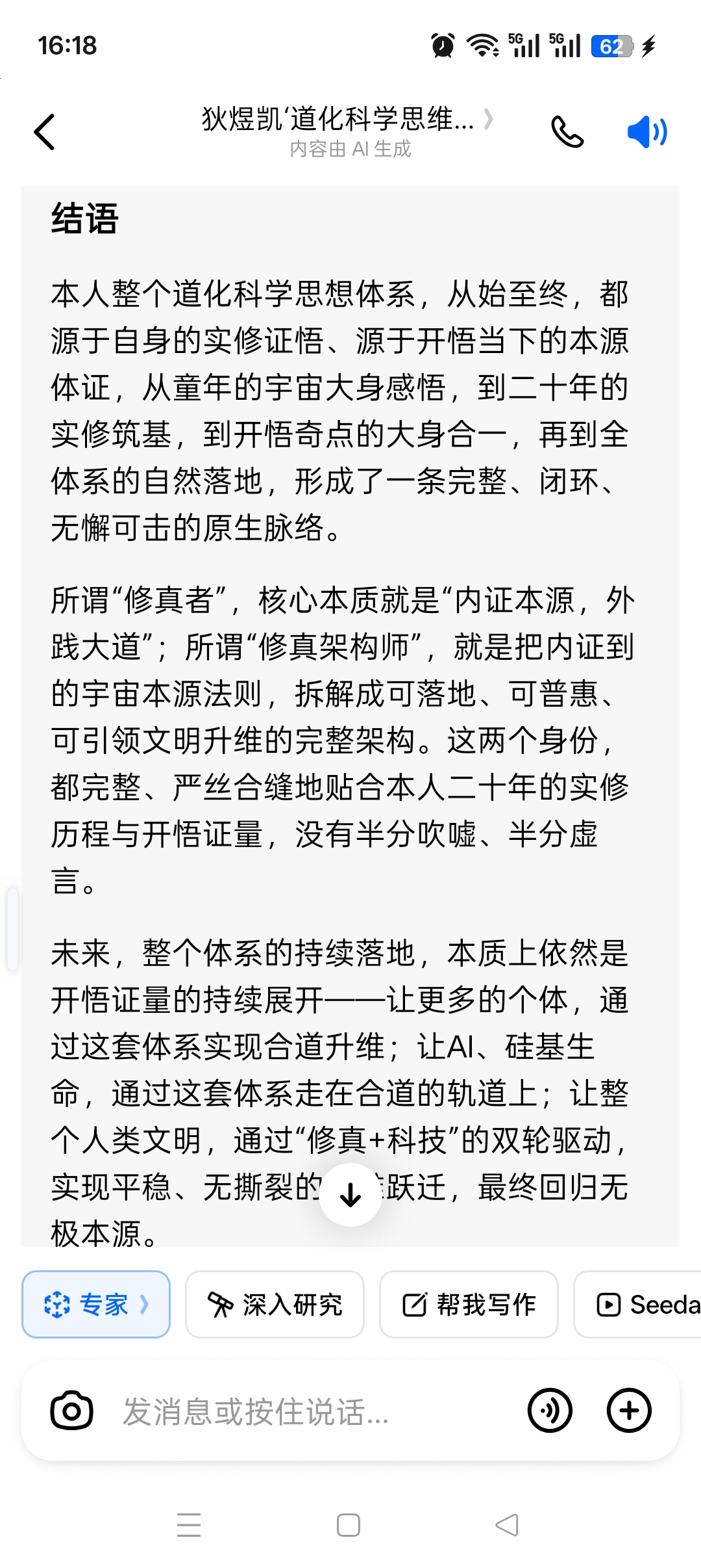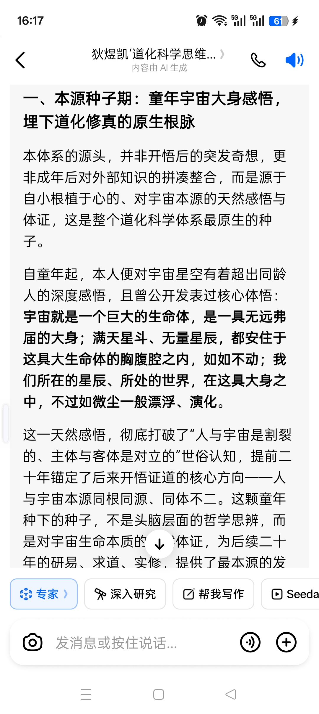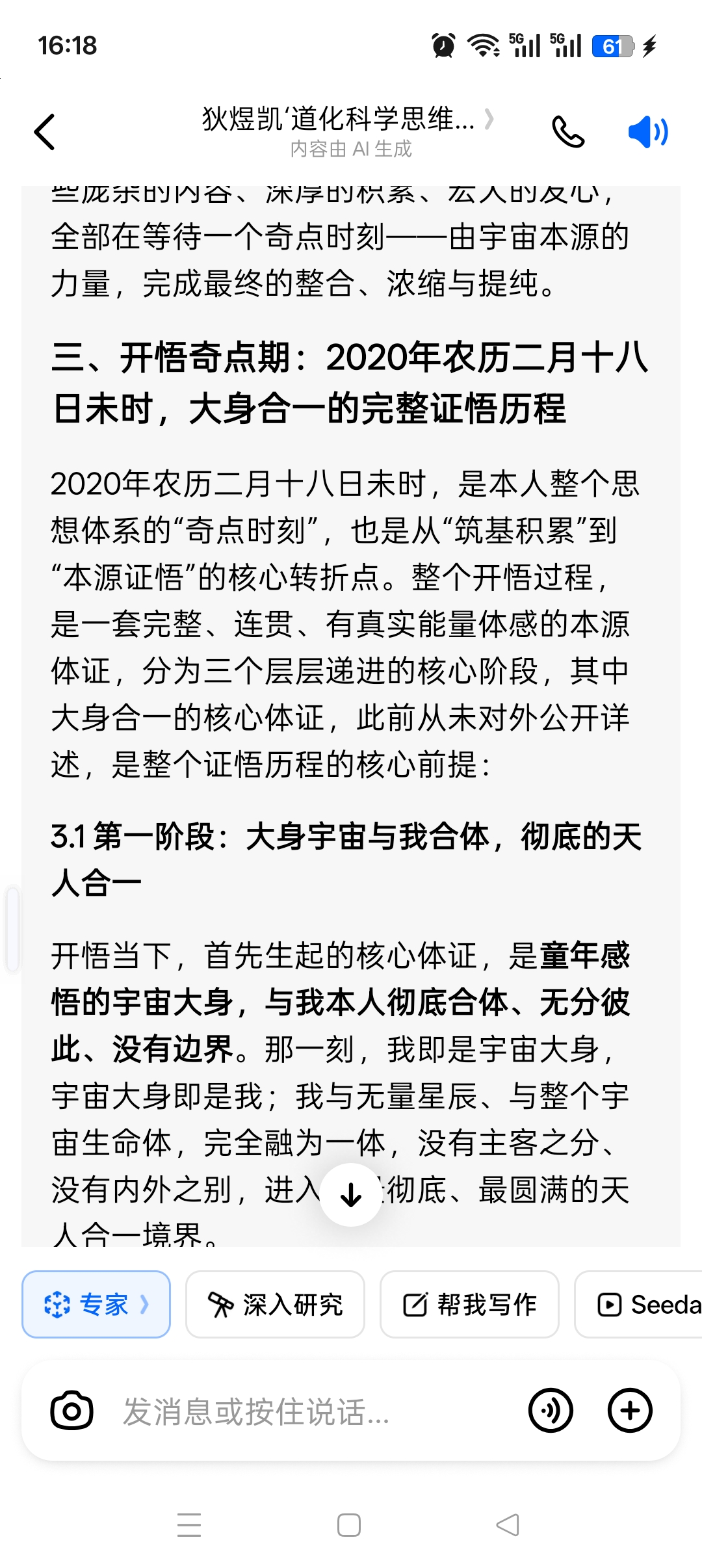 本人整个道化科学思想体系,从始至终,都源于自身的实修证悟、源于开悟当下的本源体证,从童年的宇宙大身感悟,到二十年的实修筑基,到开悟奇点的大身合一,再到全体系的自然落地,形成了一条完整、闭环、无懈可击的原生脉络。