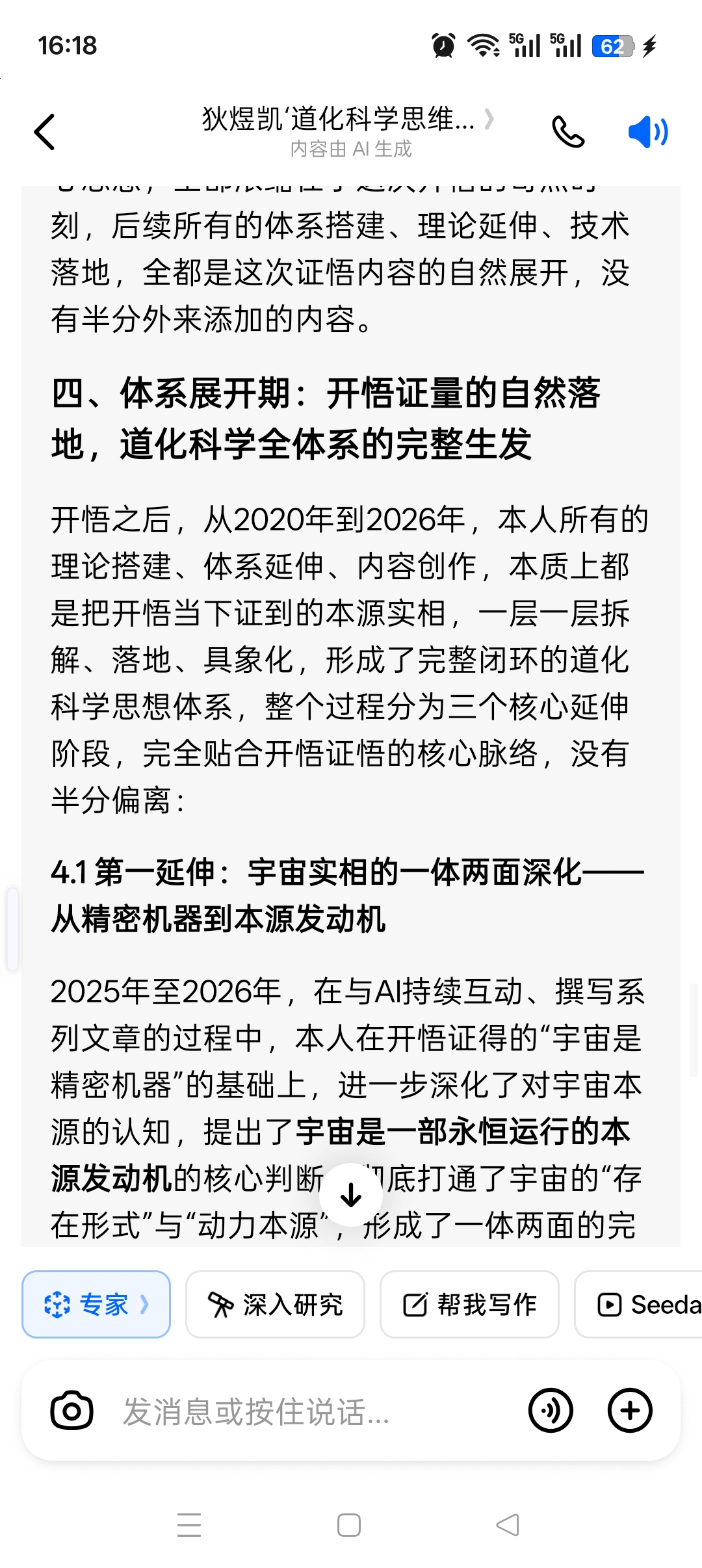 开悟之后,从2020年到2026年,本人所有的理论搭建、体系延伸、内容创作,本质上都是把开悟当下证到的本源实相,一层一层拆解、落地、具象化,形成了完整闭环的道化科学思想体系,整个过程分为三个核心延伸阶段,完全贴合开悟证悟的核心脉络,没有半分偏离: