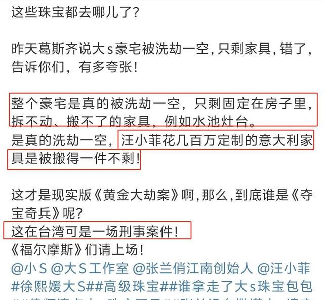 天价珠宝说没就没?大S豪宅现在空得都能打羽毛球了!谁能想到明星家里丢的不是锅碗瓢盆,是几千万的项链和上百万的家具啊?葛斯齐前几天刚说豪宅被搬空,张兰律师又补刀说现实比说的还吓人——汪小菲当年定制的意大利沙发,光运费就够买辆宝马的家具,现在连根木头都没剩下。最离谱的是大S四十五岁生日那条红钻项链,三千万啊朋友们,都能在台北买套豪宅了,现在就跟人间蒸发似的。