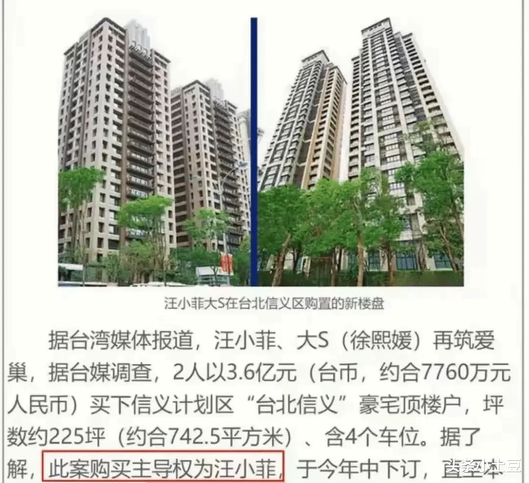 台北信义区价值4.6亿新台币的豪宅,需每月还百万房贷,该房产首付由汪小菲支付,直至大S与具俊晔再婚,汪小菲随即断供。