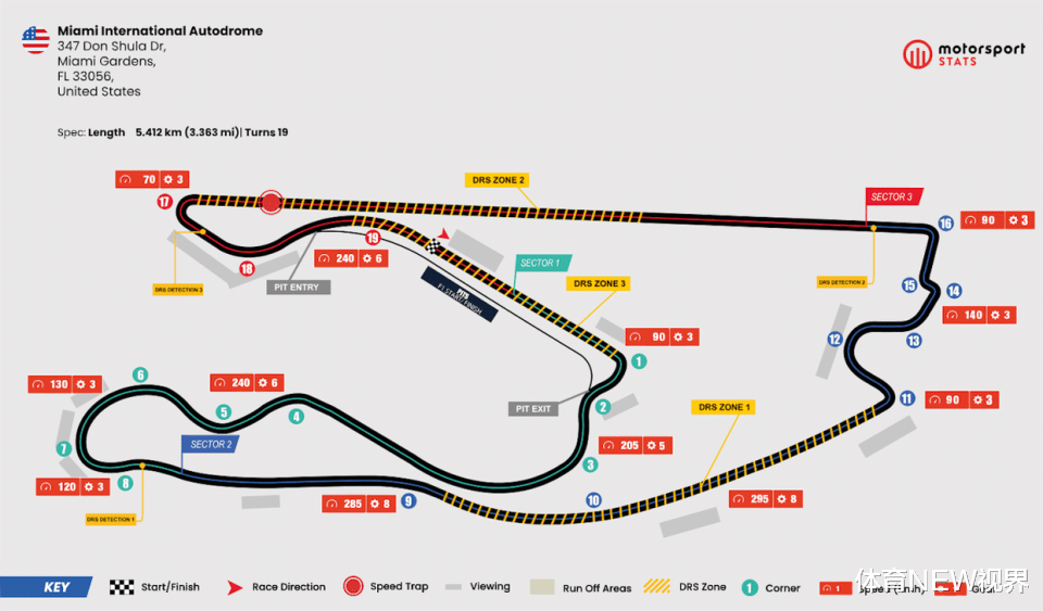 逆时针走向的迈阿密赛道虽有3个DRS使用区且极速可达340km/h,但在路面宽度大多仅能容纳二至三辆赛车且弯道大多属中低速弯下,本赛道为全油门比例仅略高于50%的中速防守型赛道,而且在赛道路面需配合佛州法规使用60%的石灰岩与花岗岩作为路面材质下,如何让轮胎迅速达到工作温度并取得足够抓地力成为车手在大赛周的主要课题。