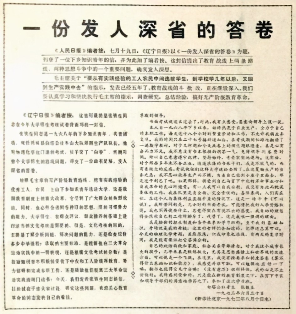 1973年夏天,辽宁日报刊登了一封手写信,一时间轰动全国。这封手写信的题目是《一份发人深省的答卷》,信中阐明了一个下乡的青年对于高考的不满,句句肺腑之言引起了不少读者的共鸣。他在卷子的背面写的那封信中写得明白: