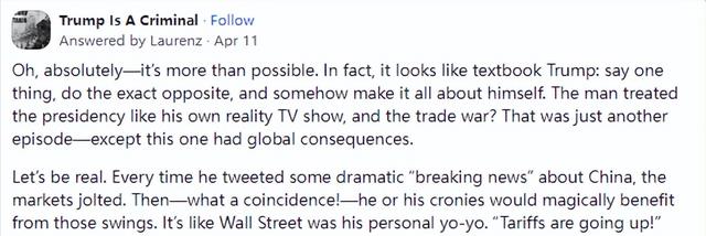 另一位网友评论道,一旦你意识到特朗普所做的每件事都是为了个人利益,那么他的贸易战是为了加强美国的想法就令人发笑了。