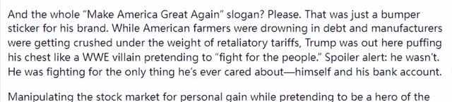 还有整个“让美国再次伟大”的口号,拜托,那只是他根本不知道如何发展经济,当美国农民被债务压得喘不过气来,制造商在报复性关税的重压下苦苦挣扎时。