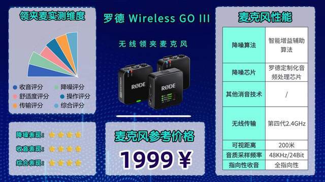 机型亮点综述:48kHz高规格采样率,人声还原纯净,音质达到专业水准,没有杂音和电流声。罗德IV系列2.4G数字传输技术超靠谱,远距离或复杂环境下都不会卡顿、断连。降噪算法先进,能有效过滤各类环境杂音,减少后期处理工作量,基础风噪抑制效果好,轻微刮风影响可忽略,强风配防风罩即可。3.5mm锁定式接口防接触杂音,高功率耳机输出可实时监听,综合表现强劲。