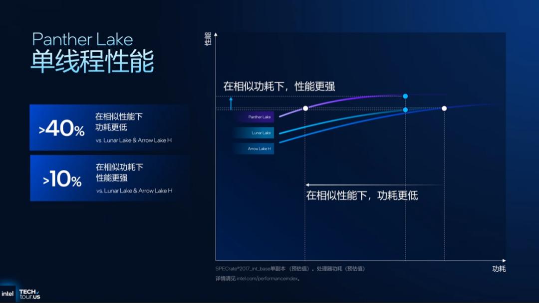 英特尔此前给出的数据是相当亮眼的。相同功耗下,Panther Lake的单线程比Lunar Lake快了10%以上;反过来比,同样的单线程性能,功耗能降低40%以上。多线程呢?相同功耗下,对标Lunar Lake能快50%以上;如果追求相近的多核性能,功耗相比Arrow Lake H能降低30%以上。