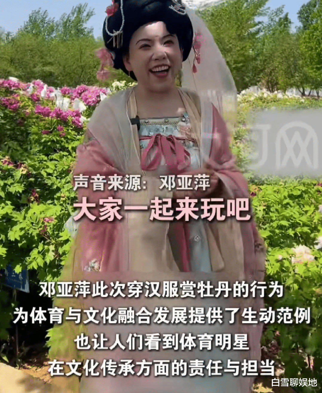 而在这场赏花会上,要说反差最大的应该就是身穿汉服的邓亚萍了。