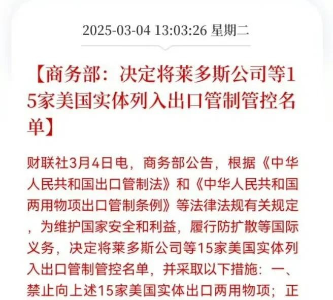 我方也早有预案,从容应对经批准,自2025年3月10日起,对原产于美国的12种进口商品加征关税。另依据《不可靠实体清单规定》多条有关规定,决定将15家美国实体列入不可靠实体清单,并采取相应处理措施。