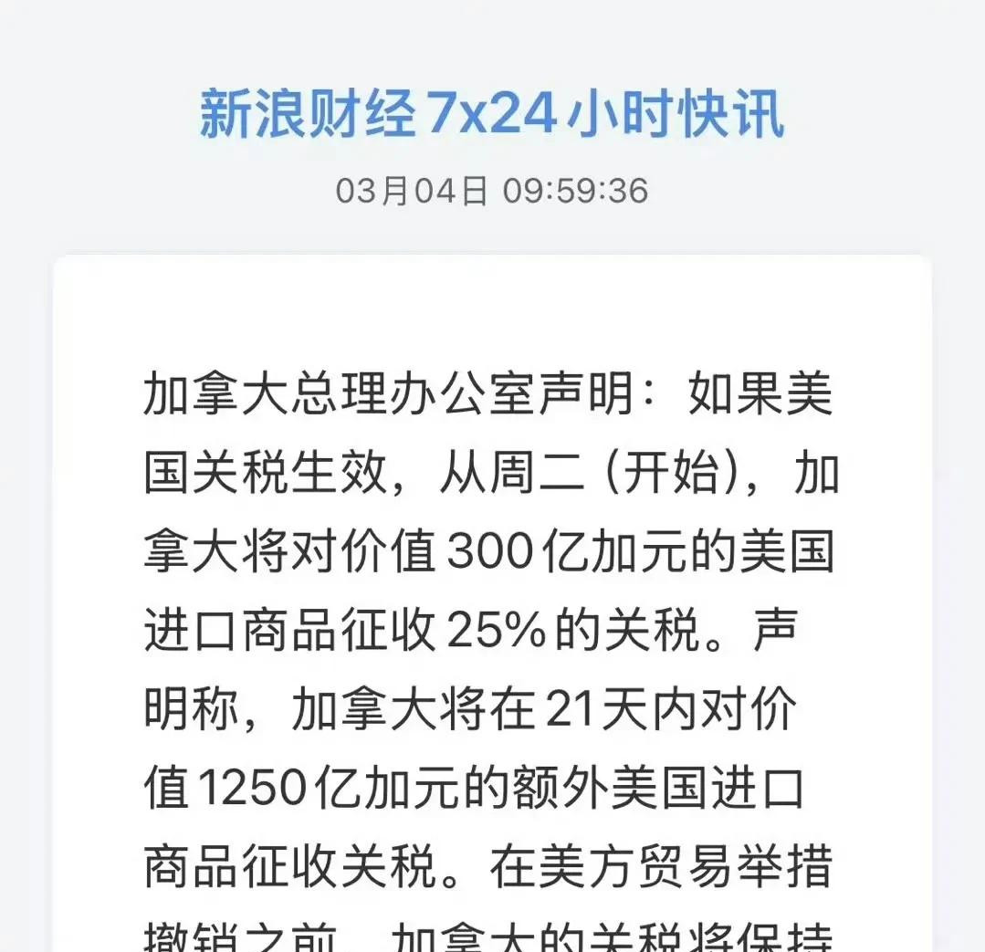 加拿大宣布反制!特鲁多表示,如果4日美国对加拿大加征关税,加将对美国商品对等加征25%关税。