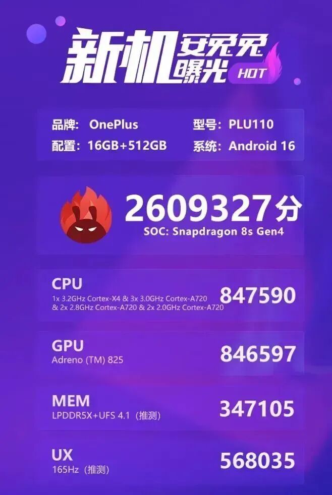 不过,安兔兔近日发文显示,其在后台发现了型号为PLU110的新机,推测应该是即将发布的一加Turbo系列新机,搭载了高通骁龙8s Gen4移动平台。