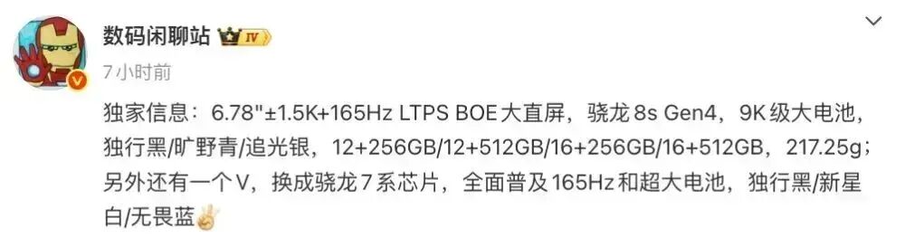 博主@数码闲聊站 近日的一份爆料中提到了一款骁龙8s Gen4机型,其配备6.78英寸左右的1.5K+165Hz LTPS BOE大直屏,内置9K级大电池,提供独行黑、旷野青、追光银等配色,提供12+256GB/12+512GB/16+256GB/16+512GB存储规格,机身重217.25g。