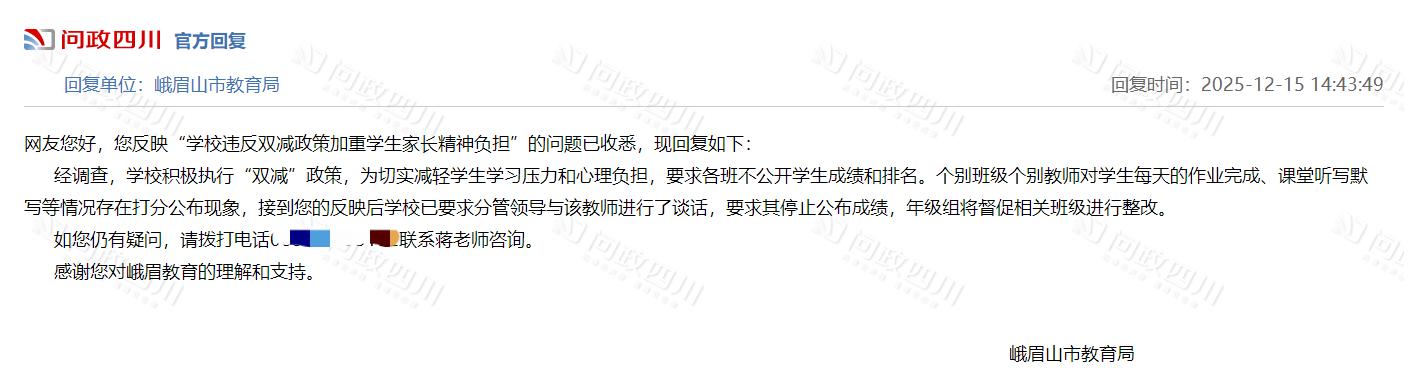 从教育局的回复来看,该校已要求各班级教师按照相关规定,不公开学生成绩和排名,但依然有个别班级、个别教师对学生每天的作业完成、课堂听写默写等进行打分并公布,但校方已制止相关教师的违规行为,接下来还会会进行整改。