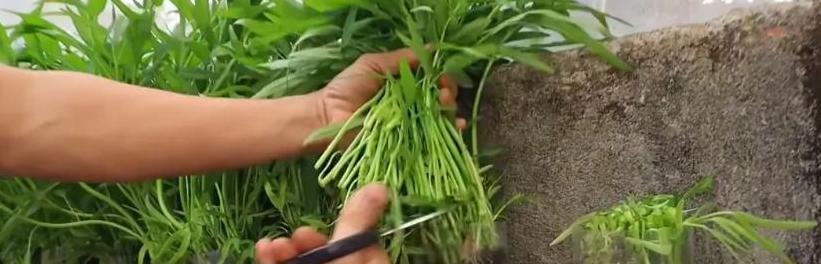 每次收割时,他都会保留植株基部的2到3节,这样空心菜就能不断发出新芽,循环采收。