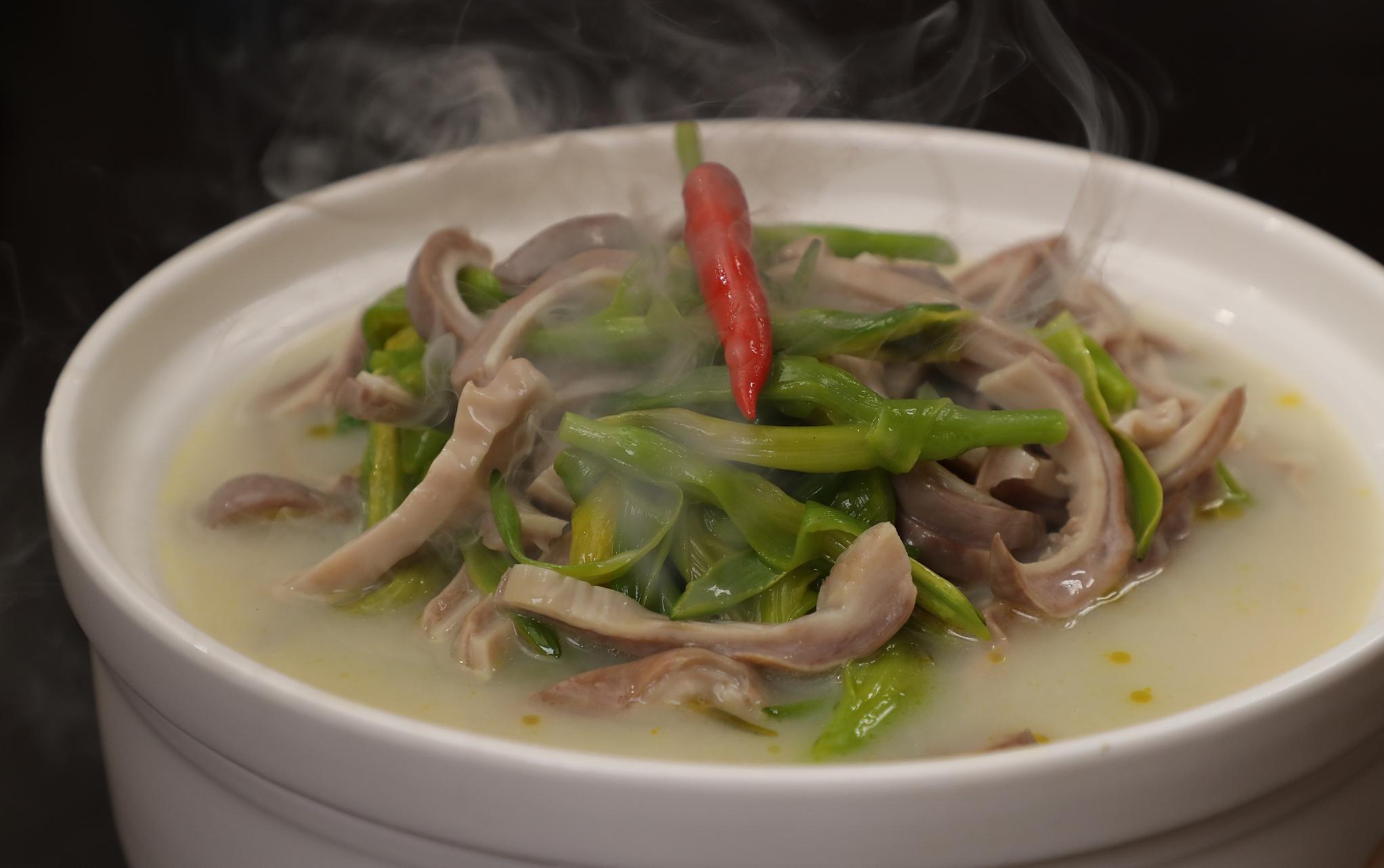这道菜选用上等鸭肉和酸笋一起焖煮,鸭肉鲜美,酸笋可口,两者结合使菜品味更加独特。