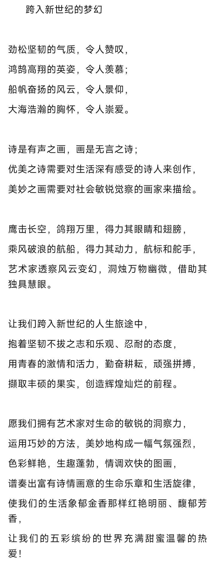 文学主张:作者须具有丰富的思考力、概括力和想象力;须具有辨别真善美和假恶丑的能力;崇尚求真,应以热爱世界、热爱人类的情感来鼓舞智慧和心灵。