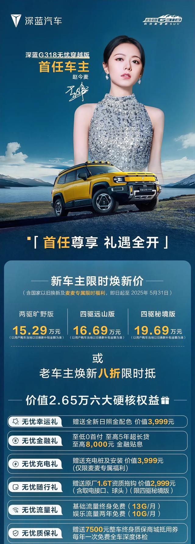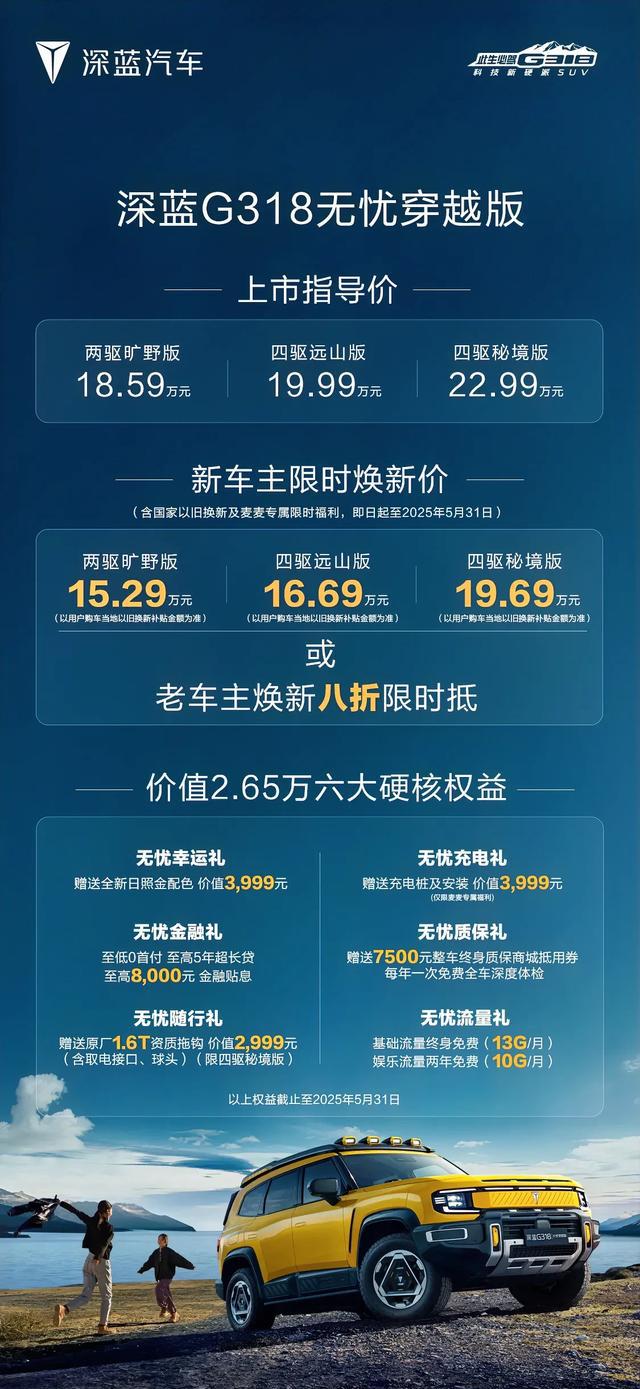 让我们从头开始审视这款车型。长安深蓝G318无忧穿越版推出了三款配置车型,其中两驱旷野版定价15.29万元,四驱远山版和四驱秘境版则分别定价16.69万元和19.69万元,这样的价格策略无疑充满了冲击力。在同级别的SUV中,深蓝凭借着价格的亲民性迅速吸引了消费者的目光。价格并不是唯一的卖点,赶上这个价位的还有一系列的优惠政策,如提供价值2.65万元的六大权益,包括金融贴息、终身质保等,给消费者带来了迸发的吸引力。