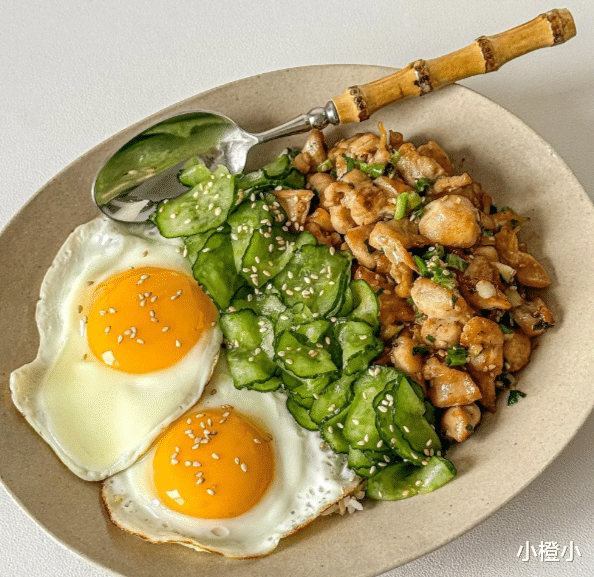 取两碗热腾腾的白米饭,先铺上葱烧鸡腿和青瓜,再盖上焦边煎蛋。吃之前用筷子轻轻一拌——热饭融化蛋黄,酱汁浸透米粒,鸡肉嫩滑、青瓜爽口、煎蛋香浓,三种口感在嘴里交织,咸鲜微甜、层次丰富,每一口都踏实又满足!