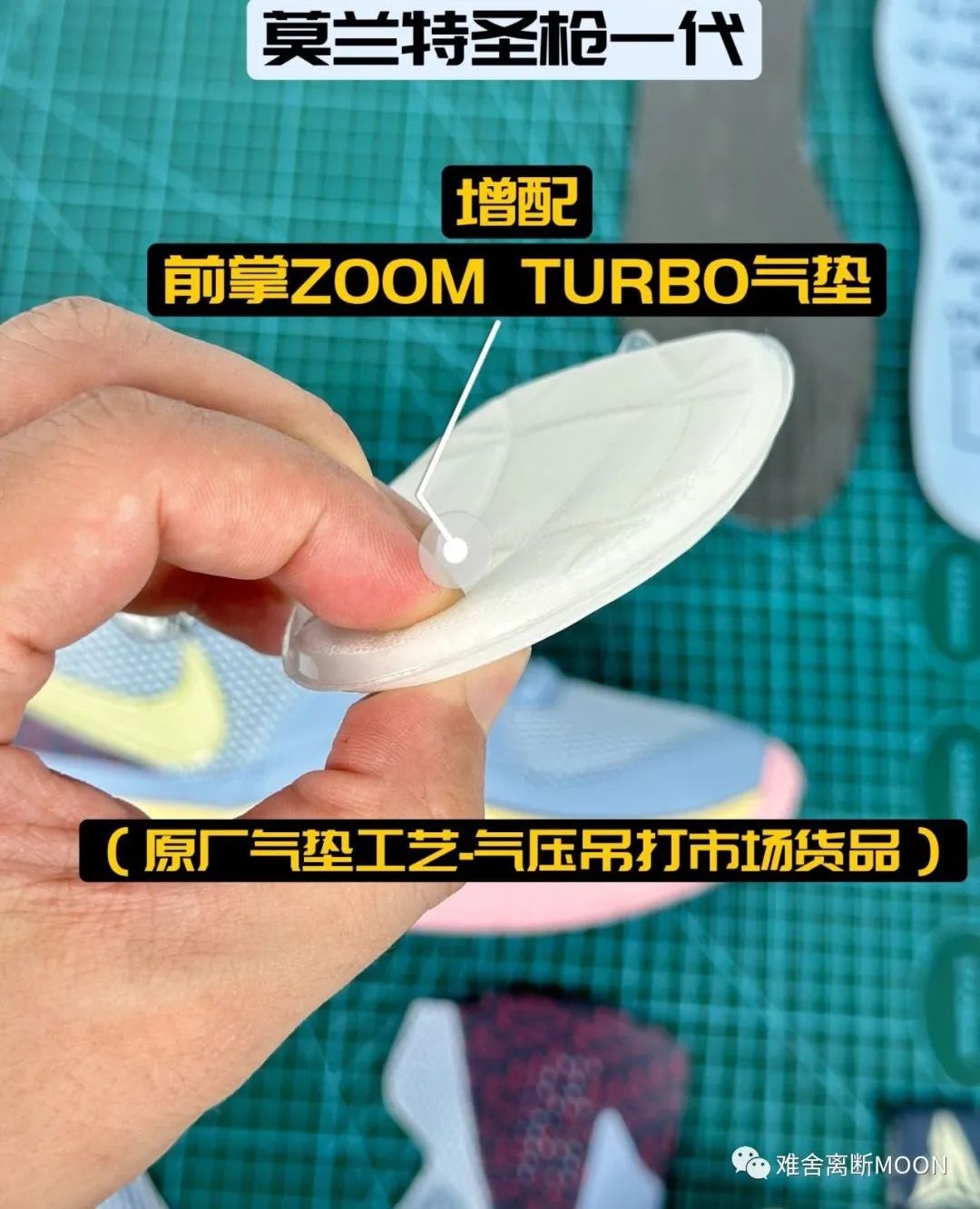 整体莫兰特一代-前掌升级为大面积ZOOM TURBO气垫-后掌增配马蹄ZOOM脚感体验100%超越一切,后面我们会着重讲一下气垫部分
