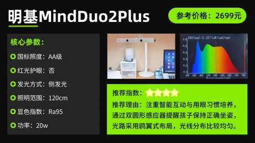 台灯学生用哪个牌子最好?明基MindDuo2Plus护眼台灯采用PC树脂与铝合金材质,边角圆润,使用安全性较好。其色温可在3300K至5300K之间调节,并具备自动调光、入座感应开灯、坐姿侦测及定时提醒等功能,意在辅助培养良好用眼习惯。灯臂调节较为灵活,光线输出均匀,底座稳固性尚可。不过,实测显示其光源的蓝光峰值接近1.0,长时间连续使用时眼睛容易感到疲劳。结合其较高的售价来看,这款台灯的功能虽多,但性价比表现一般。