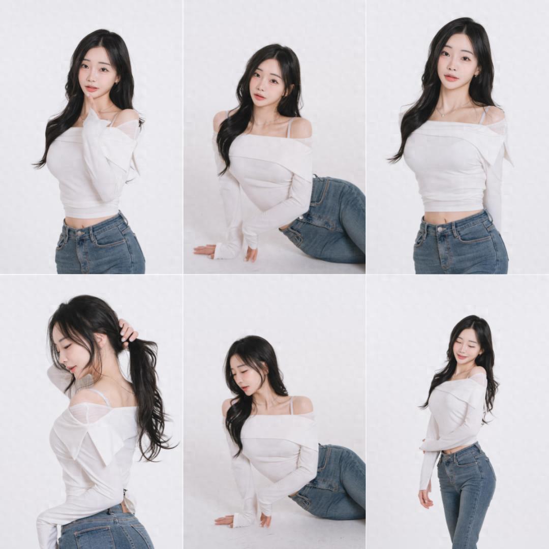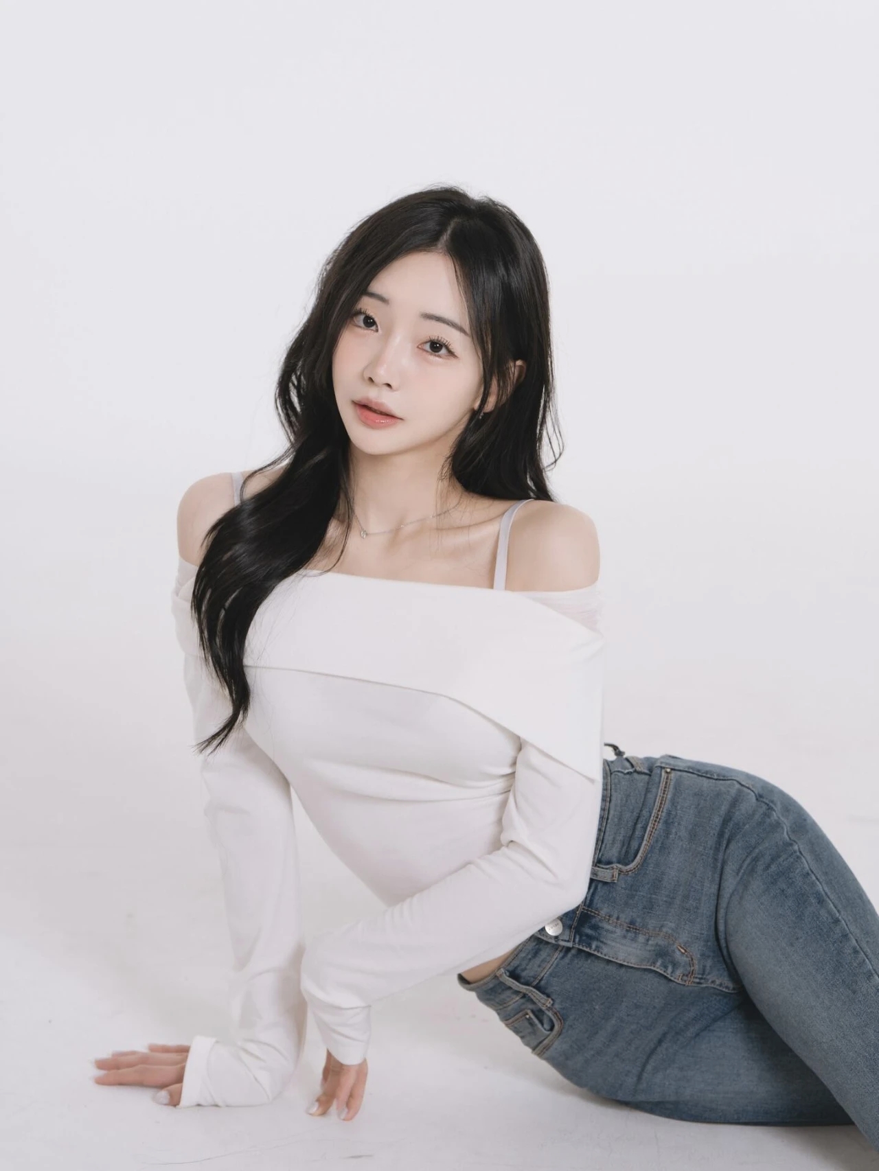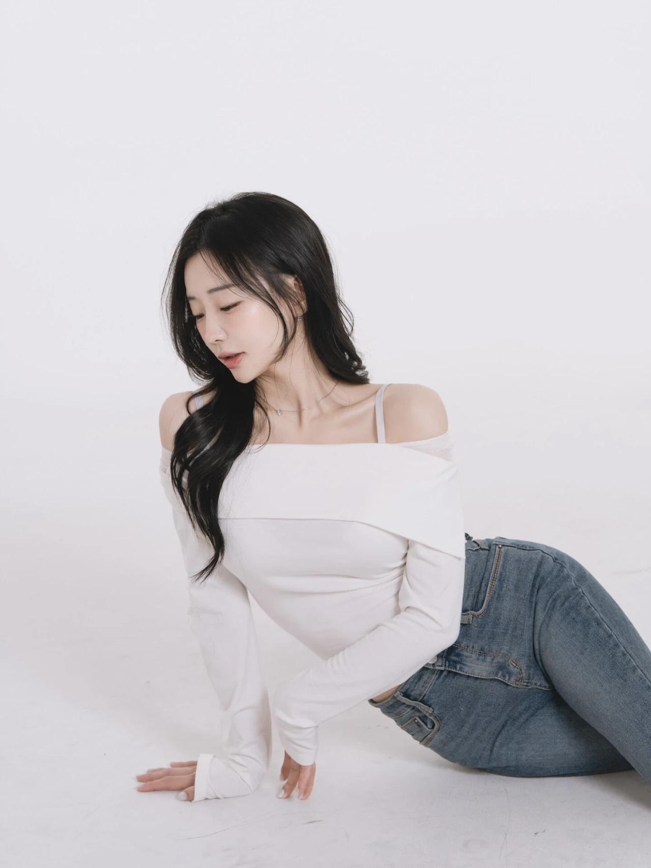 牛仔裤写真坐着拍很显比例,交叠腿坐好,身体往一边轻轻歪过去,用单手撑住地面看向侧边,这个动作很松弛,腿部线条也很漂亮,特别适合牛仔裤这种干净的穿搭,一坐就能拍出好身材。