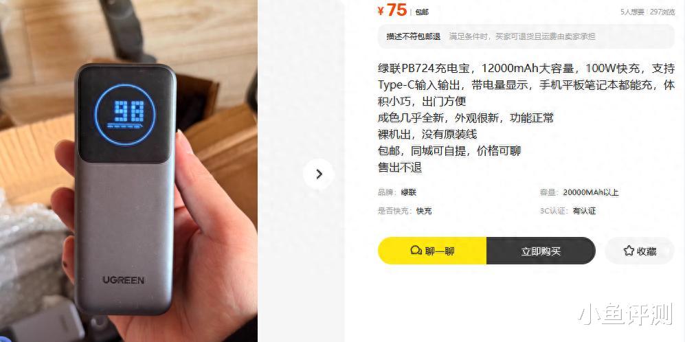 卖家说是裸机没有原装线,成色几乎全新。75元包邮还能小刀。我去翻了翻二手鱼的行情,同款普遍还在80到100块钱晃悠,这个价格确实是把价格打下来了。卖家也没藏着掖着,直接写明售出不退,这反而让我觉得挺真实。一个充电宝,功能正常外观新,只要不是到手就坏,基本没啥售后折腾的空间。