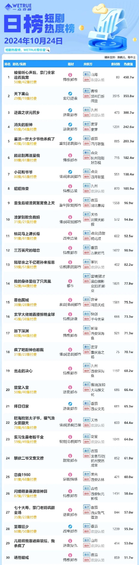 这部剧从10月24日到11月2日每天上短剧热度榜单,也连续上了9天的热度榜单。刚开始出来的时候也是排在了榜单的第一名。