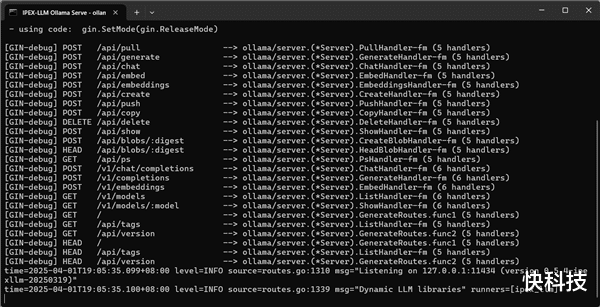 在解压目录中找到“start-ollama.bat”批处理文件,双击运行,启动Intel优化版Ollama服务,此时就和官方版Ollama运行效果一致,唯一需要注意的即使Ollama服务启用时,会有一个命令行窗口,不要意外关闭,关闭这个命令行窗口就会关闭Ollama服务。