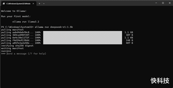 可以看到模型下载速度相当快,应该是使用了国内的镜像站,Deepseek-R1:1.5B模型只有1.1GB的大小,很快就可以完成下载开始运行。