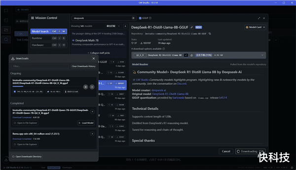在一些LM Studio的教程上会提到无法直接下载的问题,教程中会给出替换国内镜像源的方法,但我们现在实测下载速度完全没有问题,应该是新版程序已经设置了国内更快的镜像源,使用起来更加方便。