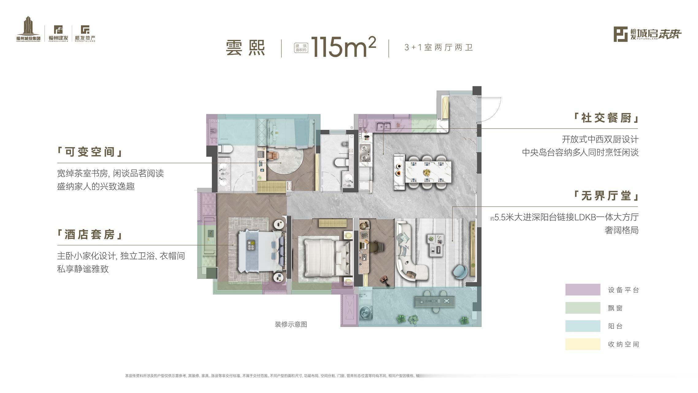 从这个115平米的3+1房户型可以看出为什么有很高的得房率,其中紫色区域为设备平台,绿色区域为飘窗,为全赠送面积,蓝色的阳台区域为半赠送面积。