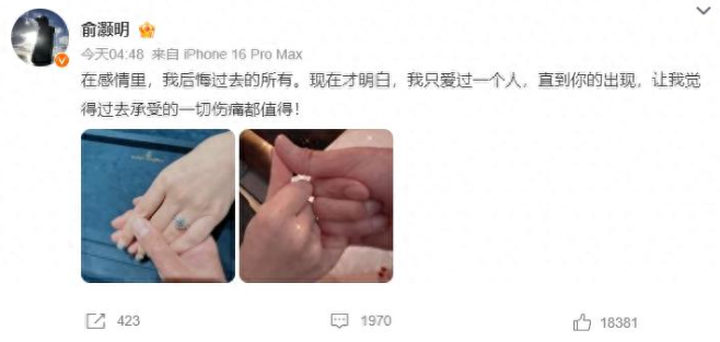 5月17日凌晨3点21分,一条微博让千万网友瞬间清醒——俞灏明晒出钻戒与十指相扣的照片,配文直击人心:"在感情里,我后悔过去的所有。现在才明白,我只爱过一个人,直到你的出现,让我觉得过去承受的一切伤痛都值得!"短短半小时,#俞灏明结婚#话题阅读量破5亿,登顶热搜第一。