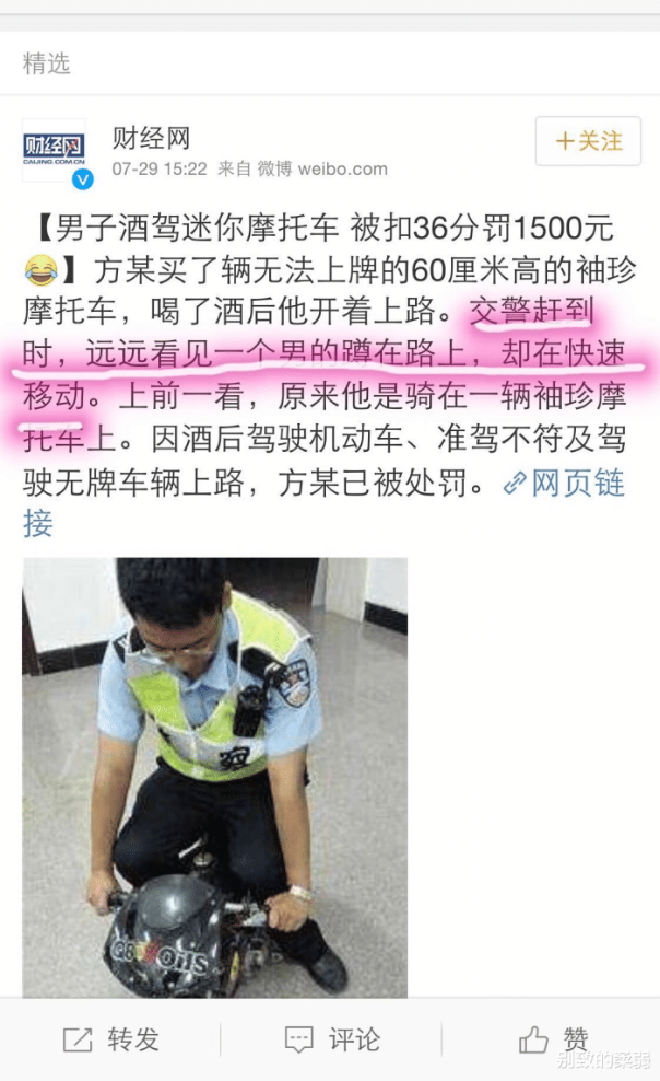 警察叔叔当时害怕极了,一名男子在黑夜中快速移动,没想到是骑着一辆袖珍摩托车,还无证驾驶,应该受到惩罚