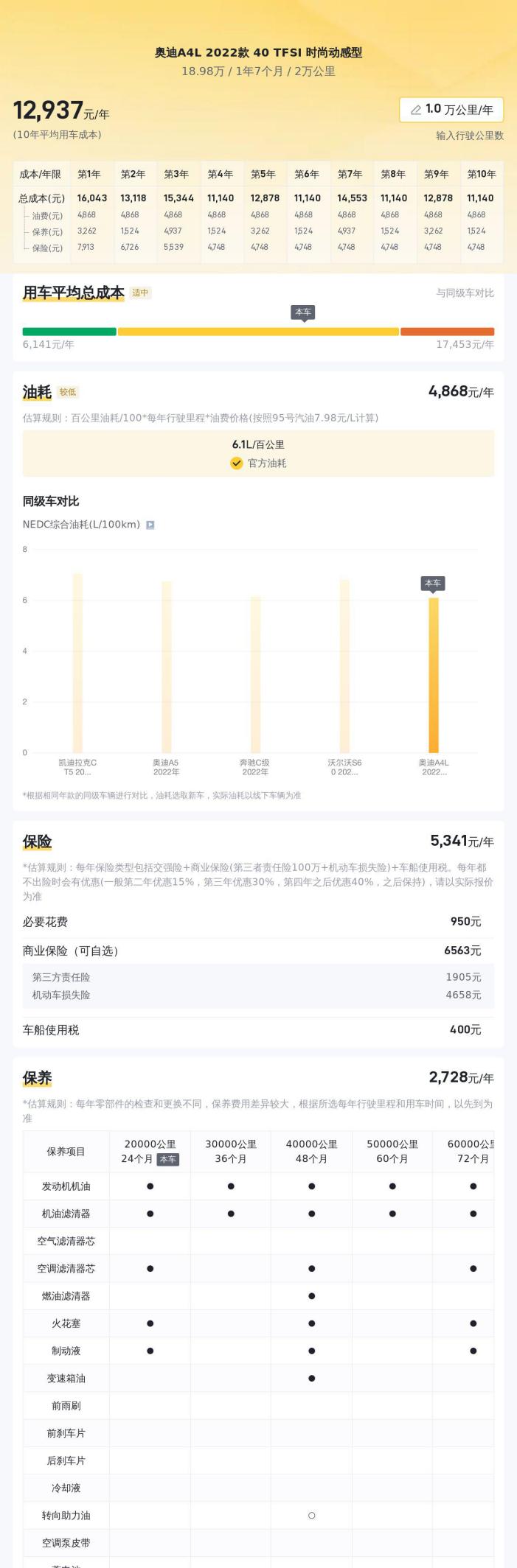 除了车辆本身的状况,还要考虑后期的用车成本。根据数据显示,这辆A4L的十年平均用车成本约为13483元/年,这其中包括燃油费、保养费、保险费等等。这个数字在同级别车型中属于中等水平,不算太高,但也需要提前做好预算。