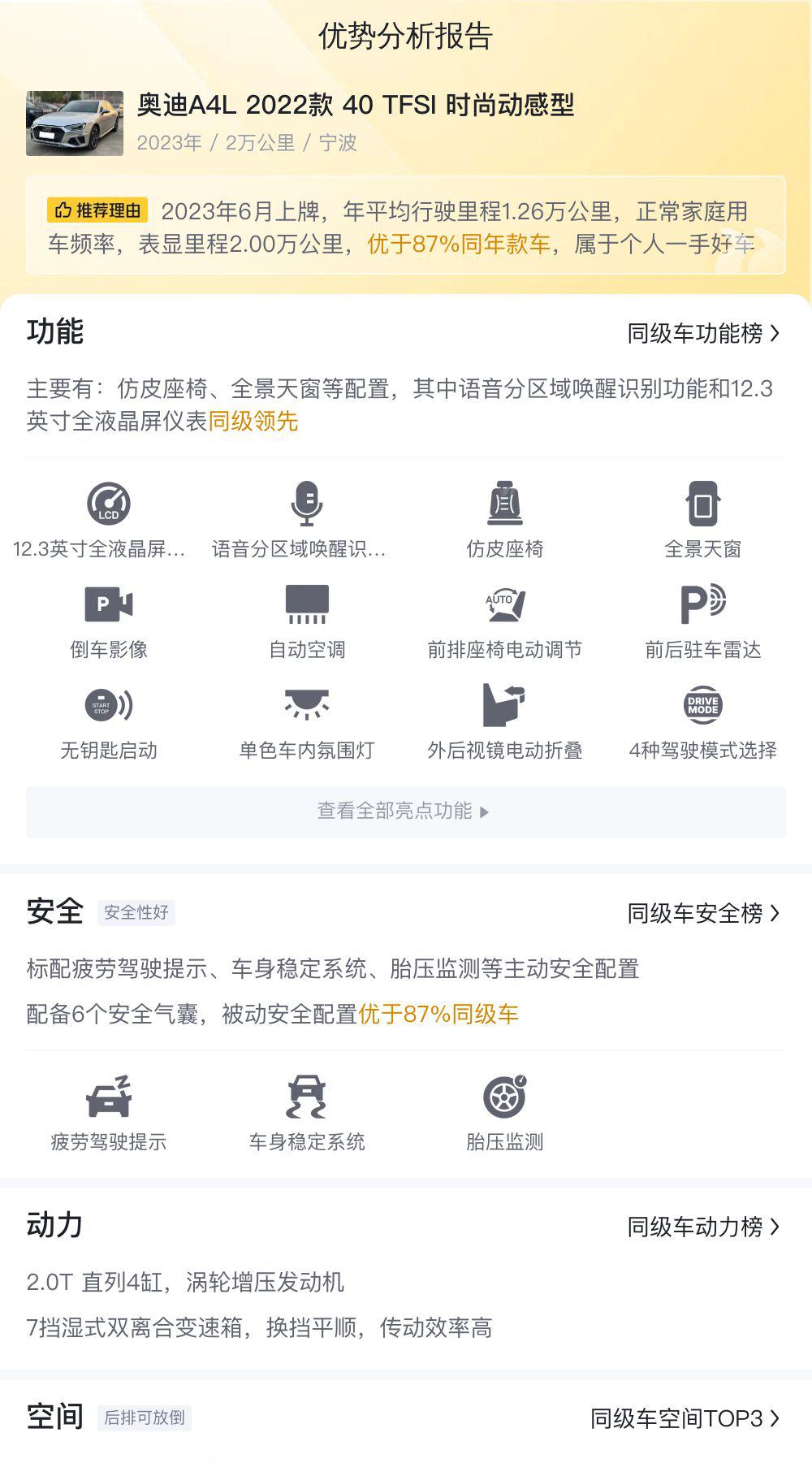 让我们先从里程和车龄说起。两万公里的里程,对于一辆一年多的车来说,属于正常范围,甚至略低于平均水平。这意味着这辆车之前的使用频率并不高,发动机和变速箱的磨损相对较小。而一年多的车龄,也意味着这辆车还处于“准新车”的状态,很多部件都处于最佳工作状态。从这两个方面来看,这辆A4L的性价比似乎还不错。
