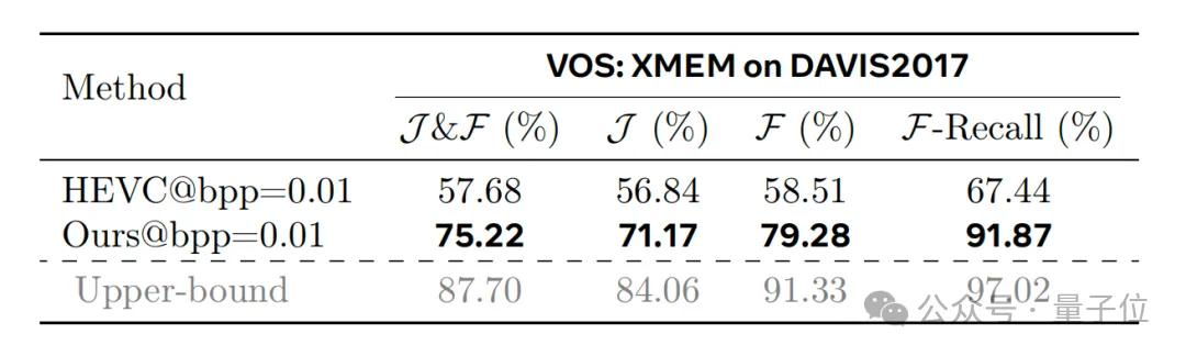 为此,团队在DAVIS2017视频分割任务上进行了验证;结果显示,在bpp=0.01的极限压缩下,GVC重建视频的JF指标(衡量分割准确度)显著高于HEVC。