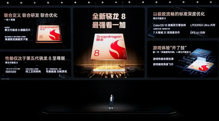 一加Ace 6T全球首发第五代骁龙8旗舰芯片。由一加和高通历时24 个月联合定义、联合研发、联合优化,3nm工艺+Oryon架构,安兔兔跑分356万,CPU比第三代骁龙8快36%,GPU快11%。