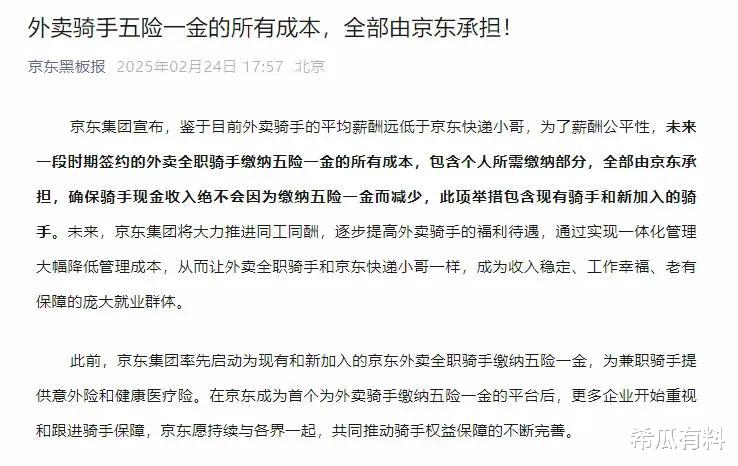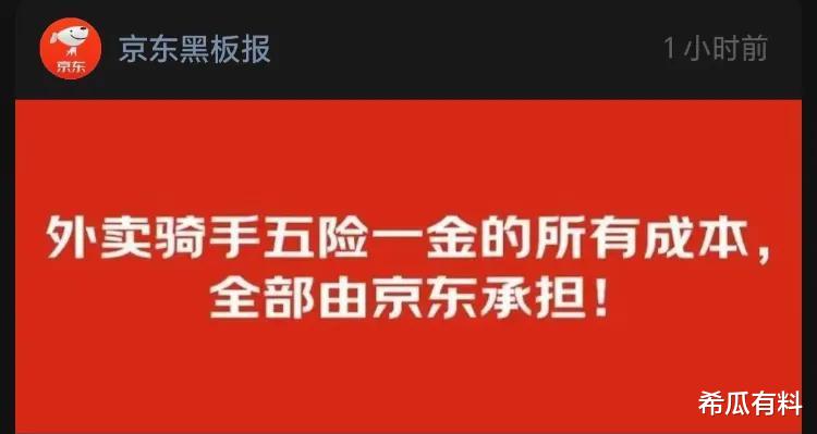 5天过后,2月24日,京东再放核弹,京东黑板报发文,宣布将承担外卖骑手五险一金的全部成本!