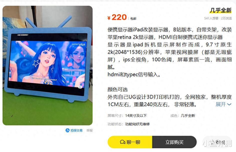 咱们先盘盘这东西到底是个啥。简单说,就是卖家把iPad上那块完好的Retina显示屏拆下来,配上驱动板和外壳,“变废为宝”。核心参数很直给:9.7英寸,原生2K分辨率(2048*1536),IPS面板,100% sRGB色域。就这屏幕素质,别说220元,就算放在几年前原机身上,那也是第一梯队的显示效果,色彩和细腻度吊打一众同价位入门显示器。如今,它脱离了iPad的身体,通过HDMI或Type-C接口,就能给你的Switch、PS4、电脑笔记本当个副屏,或者给树莓派当个显示终端。