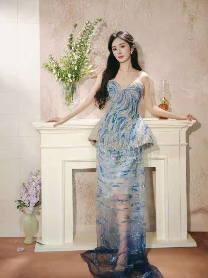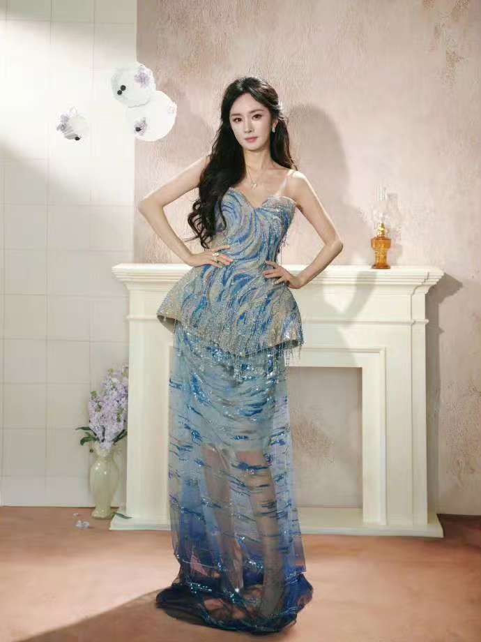 照片中,杨幂身着一件设计感十足的长裙,裙身以深浅不一的蓝色渐变铺陈,仿佛海浪在光影中起伏流动。面料轻盈而富有层次,随着她的姿态轻轻摇曳,宛如水波荡漾,折射出迷人的光泽。点缀其间的细闪元素,如同夜空中洒落海面的星光,在静谧中闪烁着梦幻的光芒。整体造型既有海洋的深邃与神秘,又不失女性的柔美与灵动,仿佛将海边的浪漫与诗意都收进了裙摆之中。