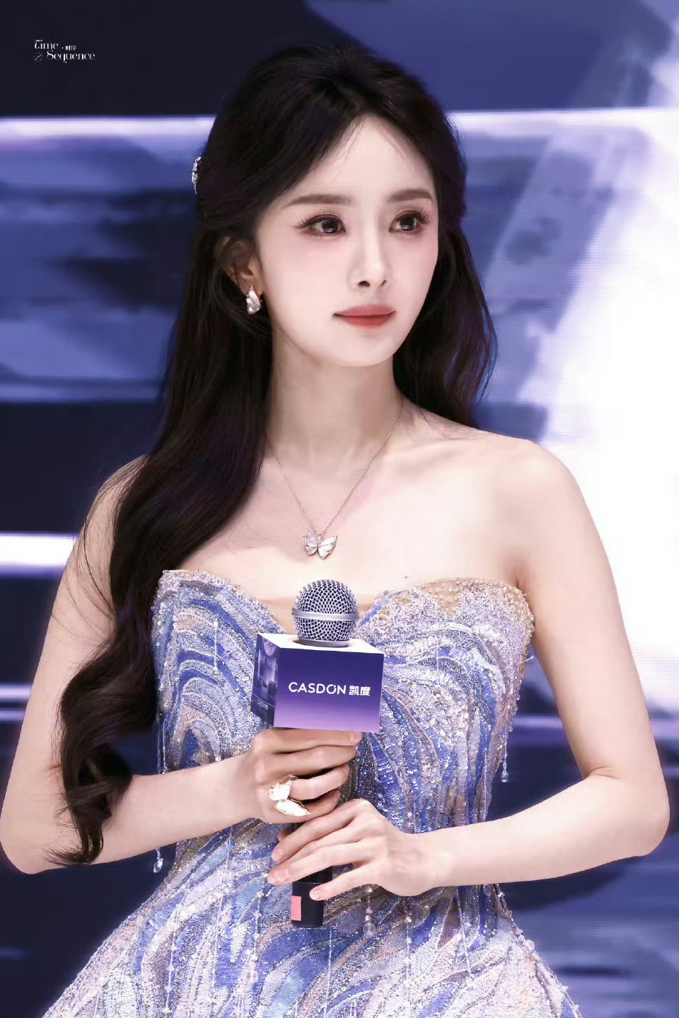这身“海洋美学”造型不仅在视觉上极具冲击力,更在细节中透露出匠心独运。从剪裁到配色,从材质到配饰,每一个环节都经过精心打磨,展现出极高的审美品位。杨幂的妆容也与整体风格相得益彰,清透自然,突出眼神的深邃与气质的纯净。她的发型简约而不失设计感,仿佛海风轻拂后的自然状态,进一步强化了“海洋”主题的氛围感。