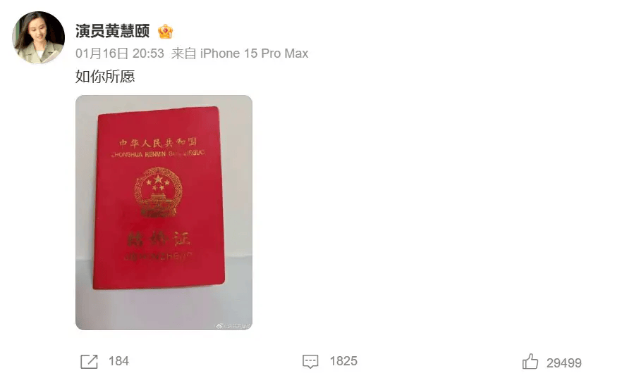 1月16号,黄慧颐直接甩出磨损的红色结婚证,配文“如你所愿”,正面回应当保剑锋工作室的起诉!两天前工作室刚否认她的“隐婚”“婚前出轨”指控,还放话要法庭见,这波反击来得又快又狠,网友直接看懵:“这是手里有实锤啊!”