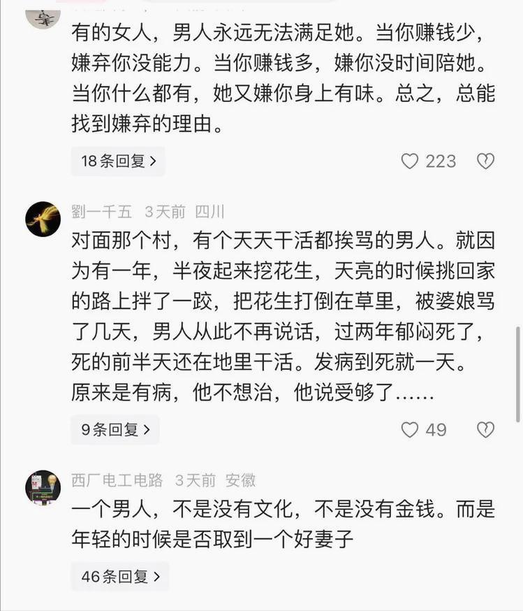 “有些女人,老公赚少了嫌窝囊,赚多了嫌不着家。真赚大发了,又嫌外面有人。你让她自己出去挣,她又说嫁汉嫁汉穿衣吃饭。”