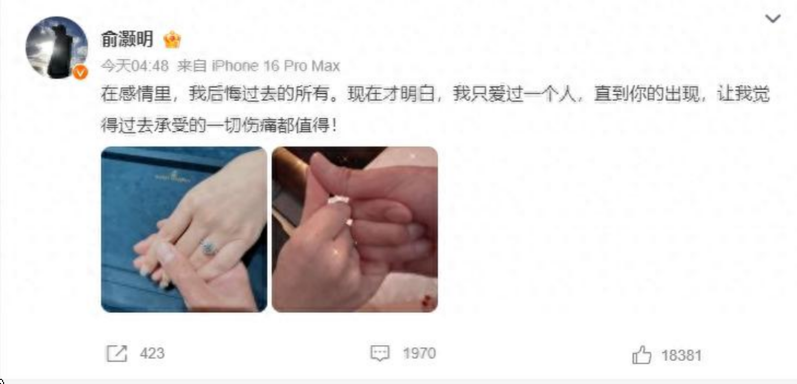 5月17日凌晨,演员俞灏明在个人社交平台晒出钻戒照片和十指相扣的牵手照,正式宣布结婚喜讯。